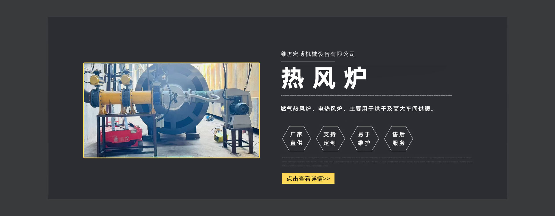 濰坊宏博機械設備有限公司是從事熱風爐、烘干設備、供暖設備的研發(fā)、設計、制造和服務于一體的實體企業。長期以來,企業以市場的發(fā)展和客戶的需求為導向,集多年的生產技術與經驗為一體,不斷開發(fā)和優(yōu)良產品。